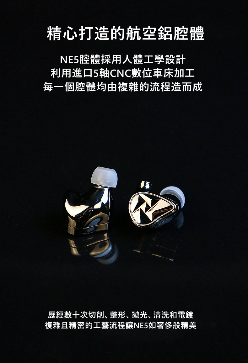 NE5 中的腔體用高精度 5 軸 CNC 加工工藝製成。它們由優質航空級鋁合金材料製成,經過拋光和電鍍處理,表面光滑有質感。腔體採用符合人體工程學的設計,確保為大多數用戶提供舒適的佩戴體驗。BGVP NE5 擁有令人驚嘆的高科技外觀,這要歸功於經過數十次打磨和拋光工藝製成的鑽石切割面板,以達到所需的光潔度。