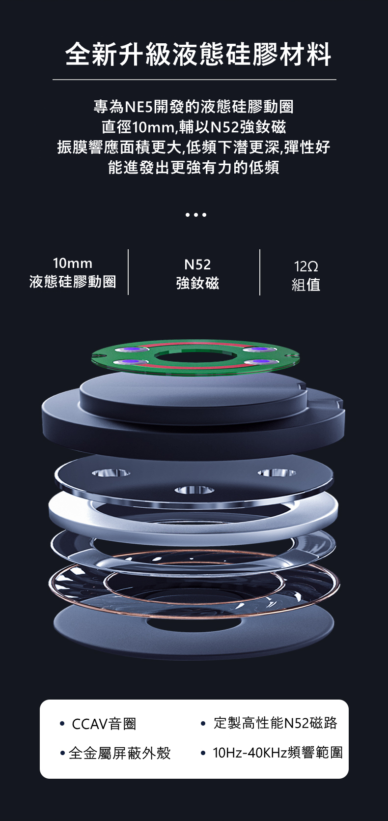 BGVP NE5 在每側採用五單元 動圈、動鐵、靜電設置。這對包含一個定制開發的 10 毫米液態硅膠動圈、兩個高性能 動鐵單元(一個 Knowles,一個 Sonion)和兩個高解析度 靜電單元。這些發聲單元經過調整,可提供流暢自然的聲音響應,具有高分辨率清晰度和豐富的人聲表現。