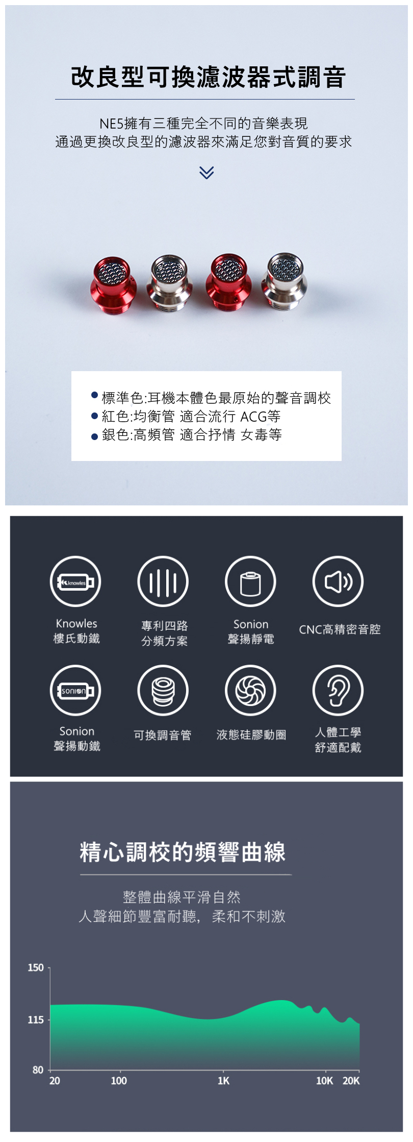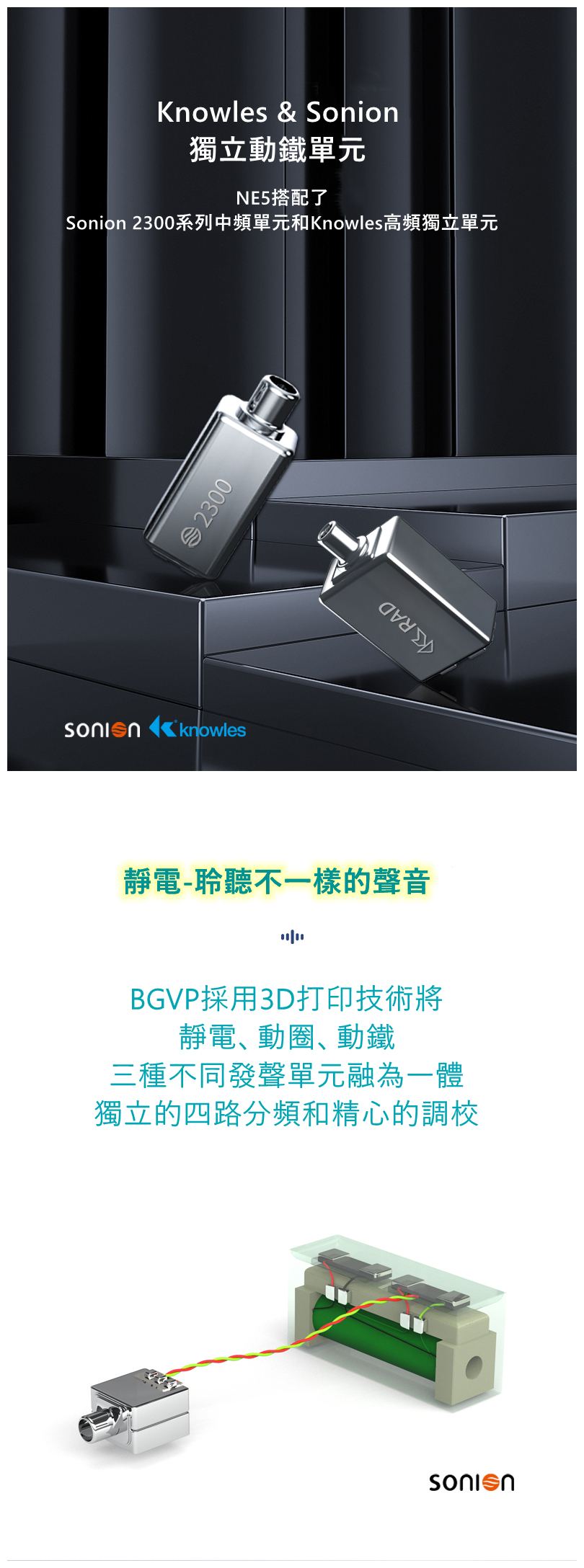 BGVP NE5 集成了專業設計的使用導音管的四路分頻。該系統將雙 靜電單元 、雙 動鐵單元 和一個液態硅膠動圈分開,獨立呈現均衡的聲音,不會出現頻率重疊問題。Sonion 2300 系列 動鐵單元產生準確的中頻,Knowles 獨立 RAD 動鐵單元提供平滑的高頻響應,雙 EST靜電單元 提供平滑且細節豐富的超高音頻率響應。