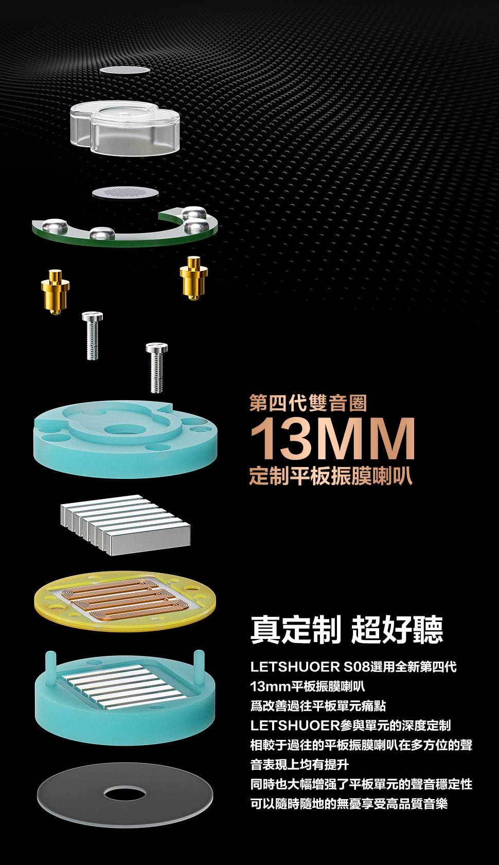 S08選用全新第四代13mm平板振膜單元,為改善過往平板單元痛點LETSHUOER參與單元的深度定制,相較于過往的平板振膜喇叭在多方位的聲音表現上均有提升,同時也大幅增强了平板單元的聲音穩定性,可以隨時随地的無憂享受高品質音樂。