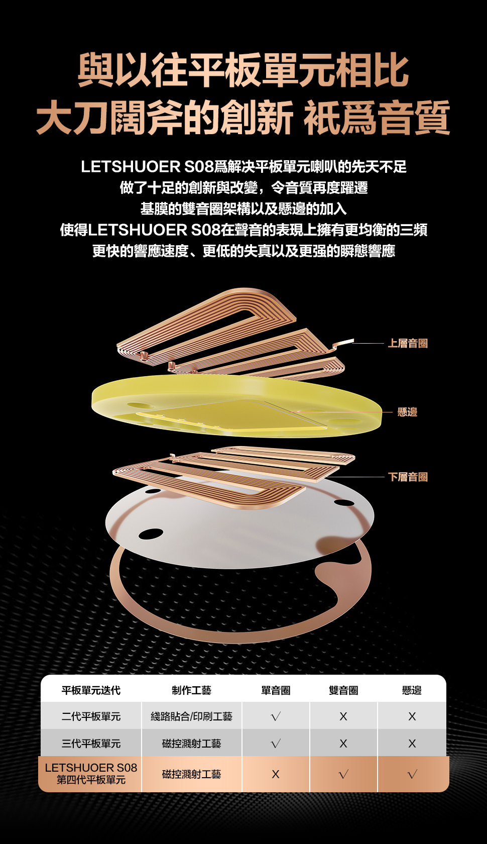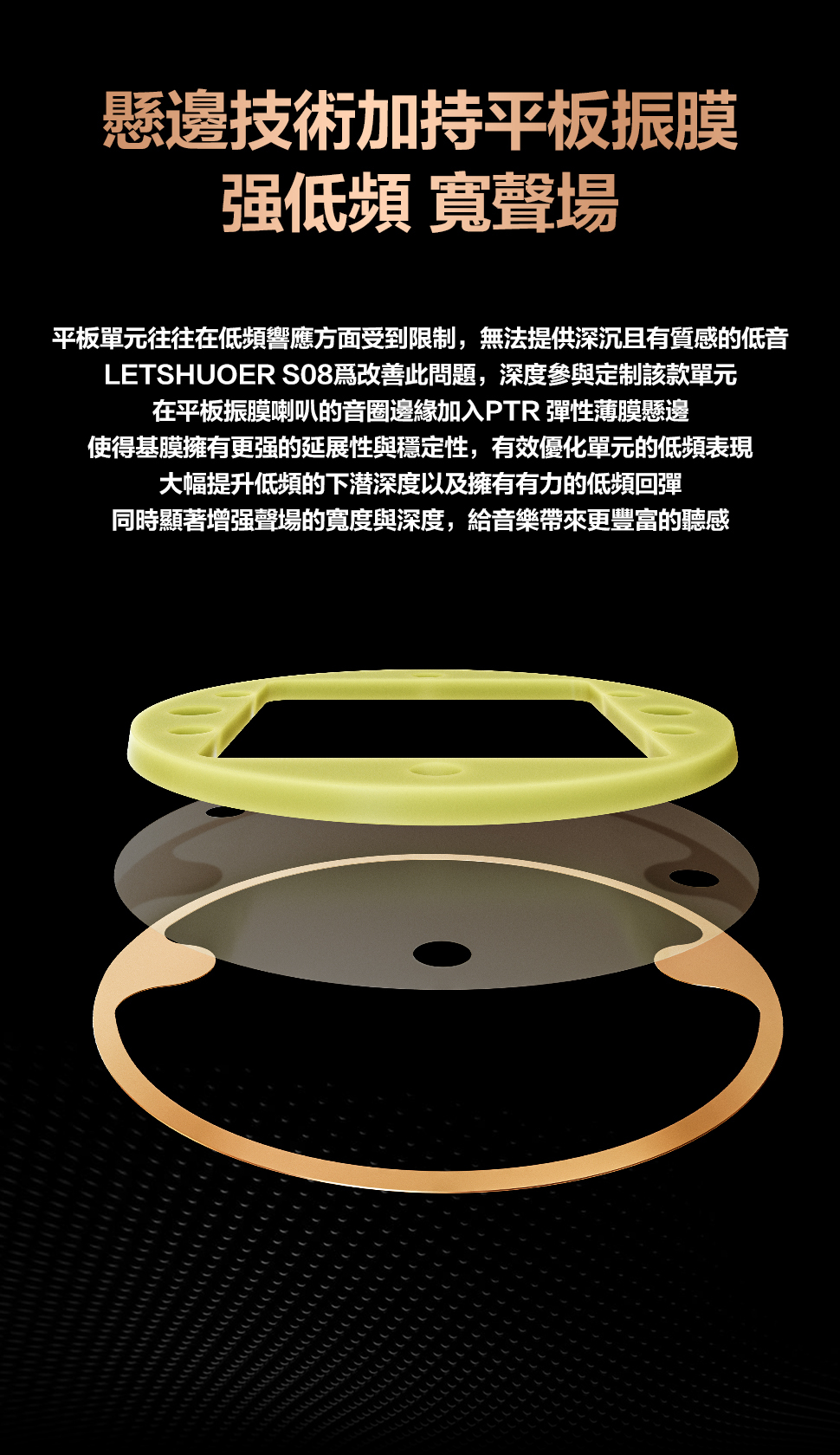 平板單元往往在低頻響應方面受到限制,無法提供深沉且有質感的低音,為改善此問題,S08在平板振膜單元的音圈邊緣加入PTR彈薄膜懸邊,使得振膜擁有更强的延展性與穩定性,有效優化單元的低頻表現,大幅提升低頻的下潜深度以及擁有有力的低頻回彈,同時顯著增强聲場的寬度與深度,給音帶來更豐富的聽感。