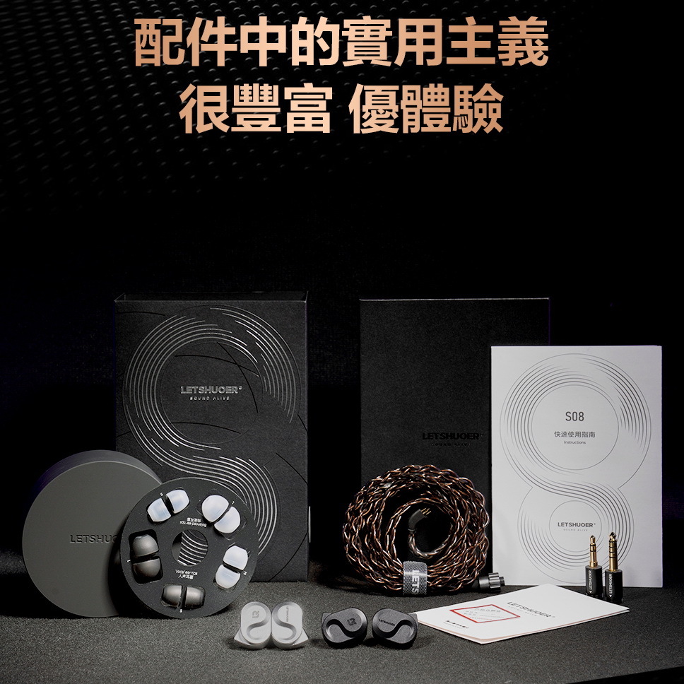 優秀線材選用,更能發揮出耳機單元的聲音潜質,S08選用4股*30芯0.05mm的高純度銅鍍銀導體,擁有高效的傳輸性能,更細膩的音樂細節刻畫、以及更豐沛的空間感,配備3.5mm以及4.4mm可换插頭,旋鈕針插卡口設計保障插頭的耐用以及牢靠,方便適配不同規格的前端設備。