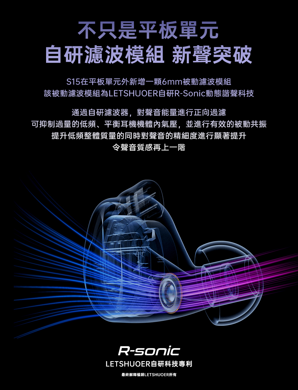 ■ 14.8mm第三代平面雙後腔振膜+6mm R-Sonic被動濾波器模組