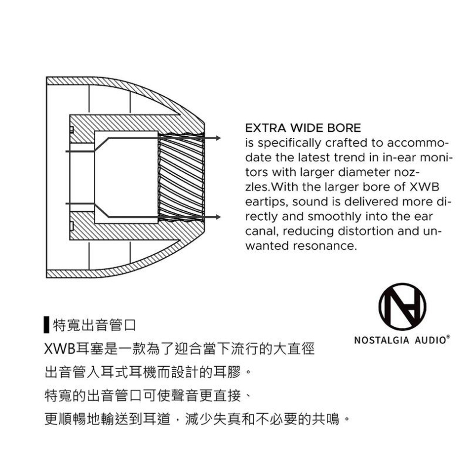 XWB耳膠具有更大的出音管口,專為配合較大直徑出音管入耳式耳機所設計。