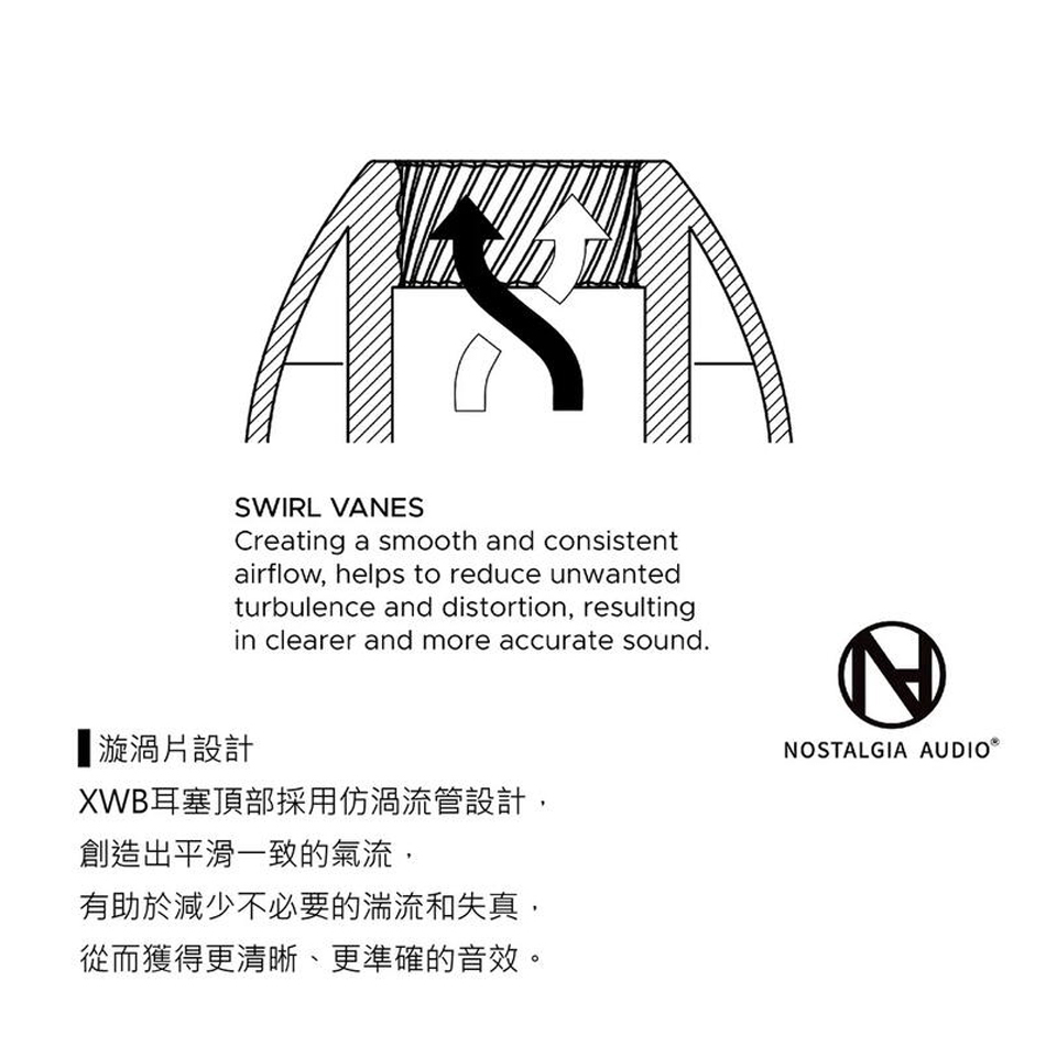 XWB耳塞頂部採用仿渦流管設計,創造出平滑一致的氣流,有助於減少不必要的湍流和失真,從而獲得更清晰、更準確的音效。