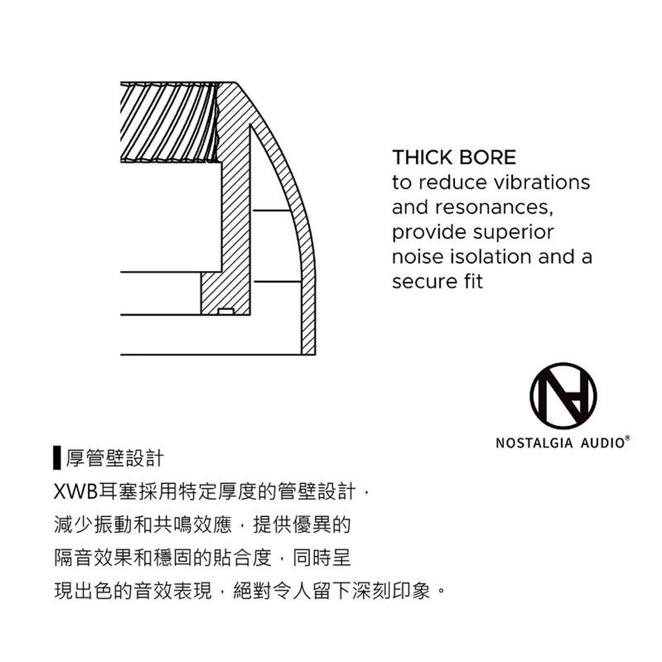 除了「特寬出音管口」設計外,我們的XWB耳膠還具有厚管壁設計,進一步提升了音質。厚管壁設計有助於減少振動和共鳴,從而產生更自然、更準確的音效。
