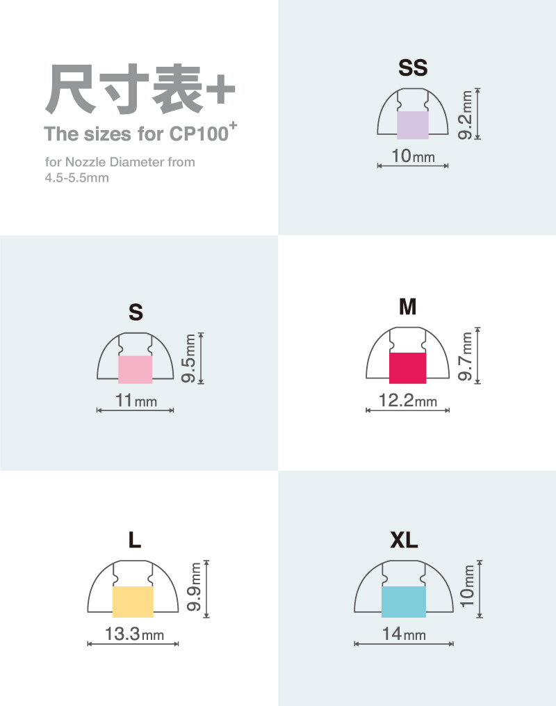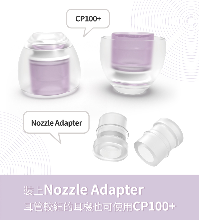 裝上Nozzle Adapter,耳管細的耳機也可使用CP100+耳塞